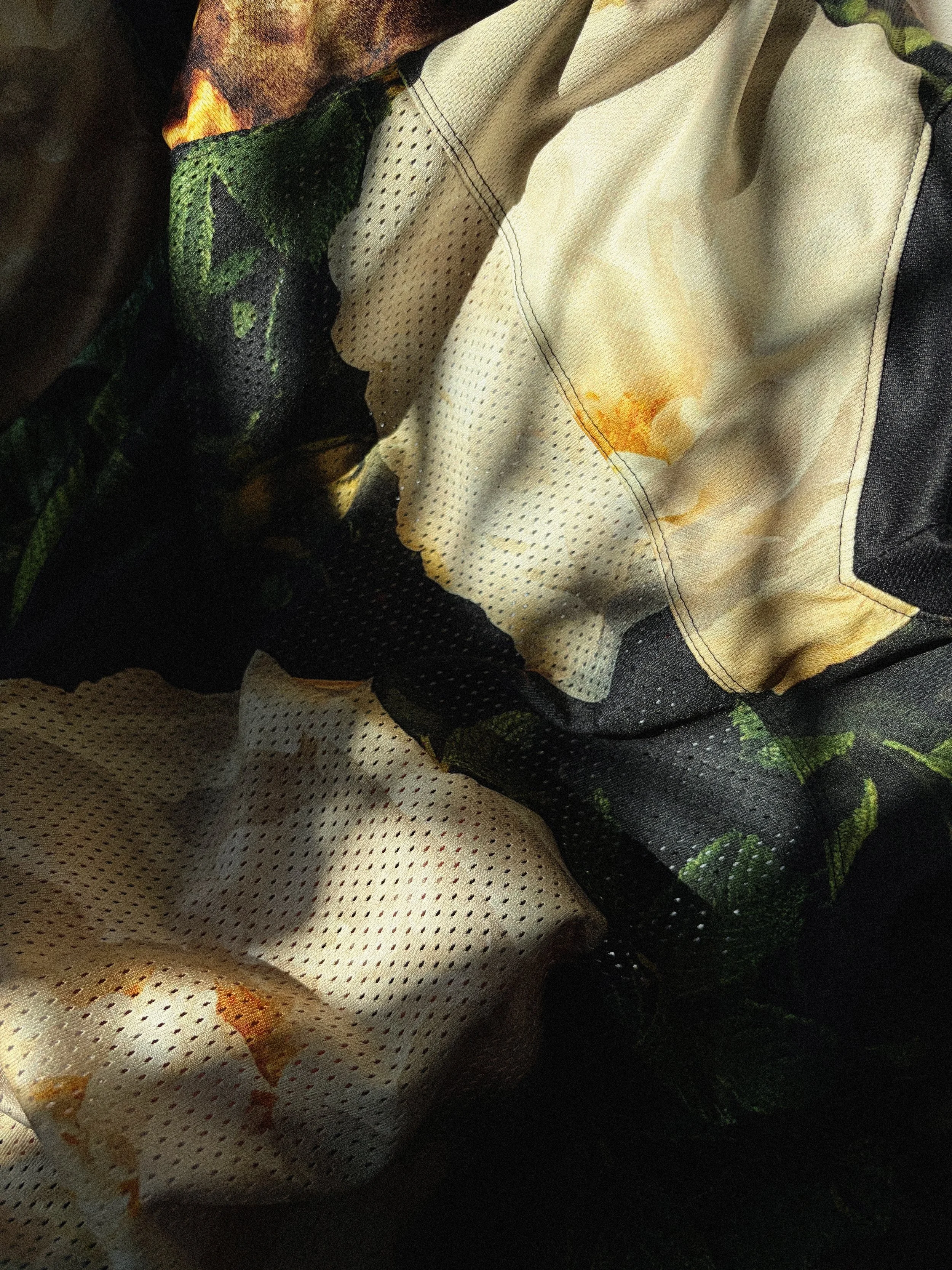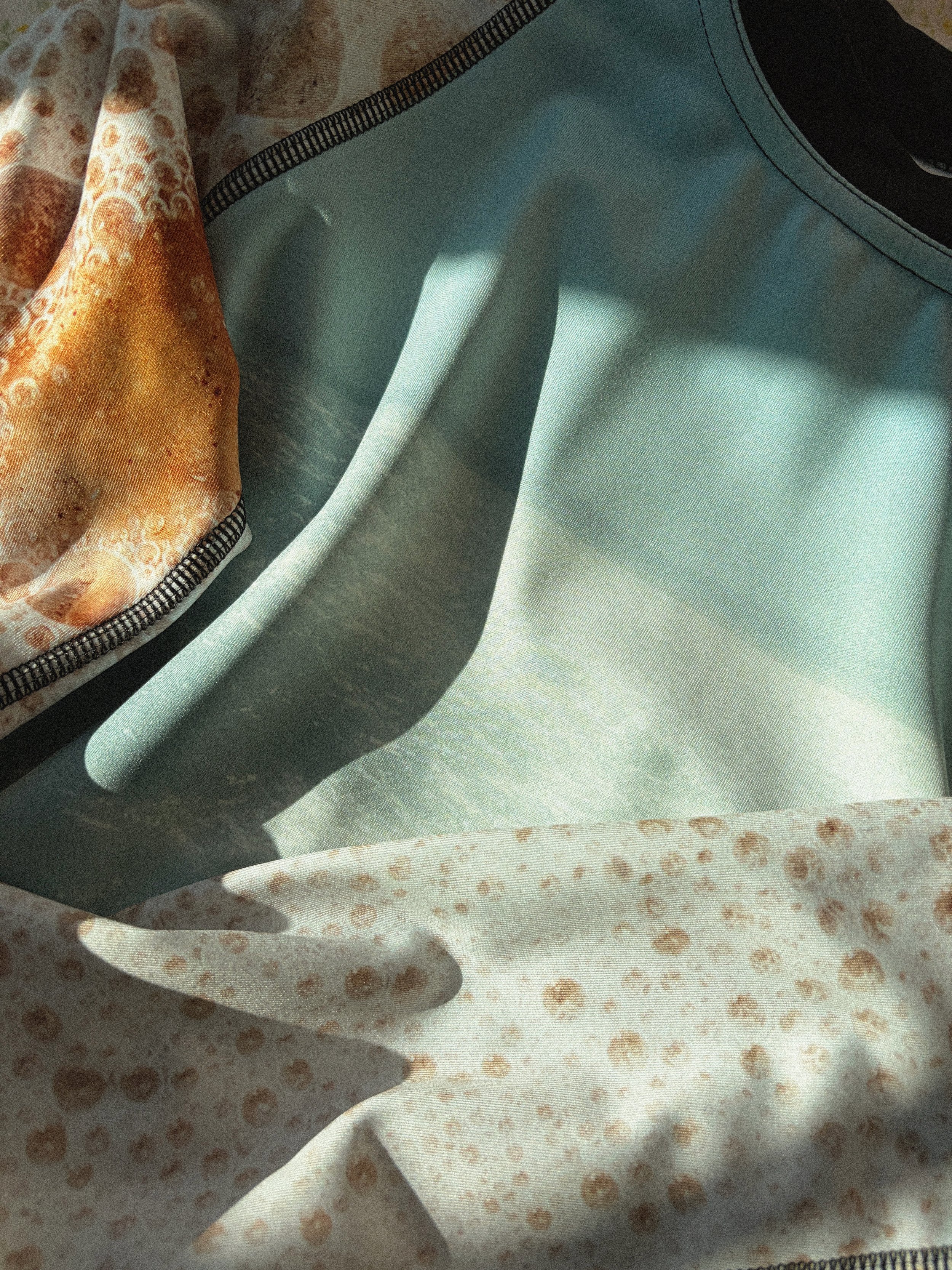 This collection draws inspiration from what has endured across deep time—oceans, plants, geological forms, the sun and celestial forces. It reworks athletic silhouettes with imagery from my own photographic archive, softening traditionally masculine forms through prints rooted in the natural world.